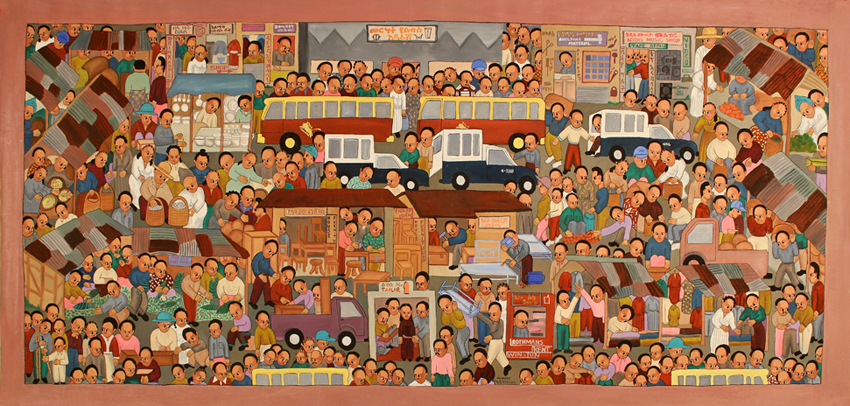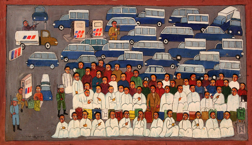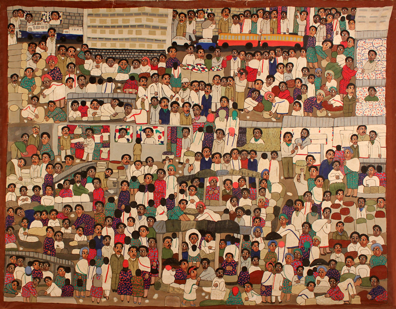 Ce grand format de Qana Sanbata montre la densité et la profusion du mercato, le marché d'Addis Abeba, souvent considéré comme le plus grand marché à ciel ouvert d'Afrique. Les textiles, les produits alimentaires, les vanneries, etc sont proposés aux acheteurs. On remarque parmi ces gens affairés un homme prenant une photographie. Un touriste peut-être ? ou bien ne serait-ce pas l'acheteur du tableau lui-même, Denis Gérard, connu pour son activité de photographe ?!