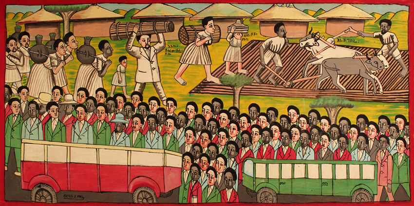 C'est le fils de Berhanu Yimane, ayant repris le métier de son père, qui propose ce tableau. Il a peint des scènes moins traditionnelles que celles privilégiées par son père, plus urbaines, témoin de son époque. Ici tout nous indique que le mariage a lieu à la ville : la mariée est en blanc et le marié en costume trois pièces sombre, à l'occidentale ; des voitures ornées de rubans forment le cortège ; un caméraman immortalise l'évènement. Des éléments de culture amhara se distinguent bien entendu, comme les gens vêtus essentiellement de blanc, les chants accompagnés du tambour et du masinqo, le violon monocorde, ou encore cette danseuse ayant noué sa natala autour de ses hanches.