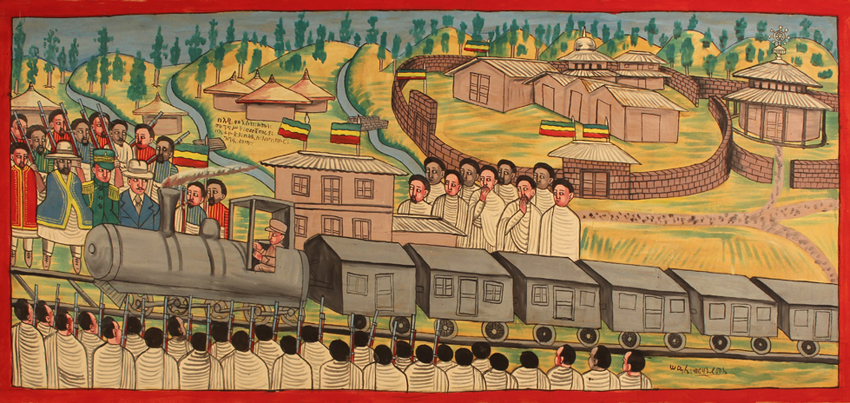 Cette peinture représente la première arrivée en gare du chemin de fer à vapeur (babur) à la gare d'Addis Abeba, du temps de Ménélik, comme l'indique la légende. Pourtant la ligne du « chemin de fer franco-éthiopien » allant de Djibouti à Addis Abeba en passant par Diré Dawa fut terminée et fonctionnelle en 1917 (soit plusieurs années après la mort de Ménélik), et ce n'est qu'à la fin de 1929 que le bâtiment de la gare est terminé à Addis Abeba. Cette scène représentant Ménélik à la gare d'Addis Abeba est donc bien une construction mémorielle très loin des réalités historiques.