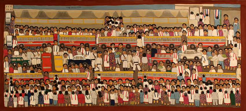 Ce grand format rend avec fidélité l'impression de densité de population aux stations d'autobus. L'alternance des robes blanches et les robes à pois des femmes produit un effet esthétique saisissant. La police est présente au centre du tableau mais ne semble pas particulièrement intervenir.