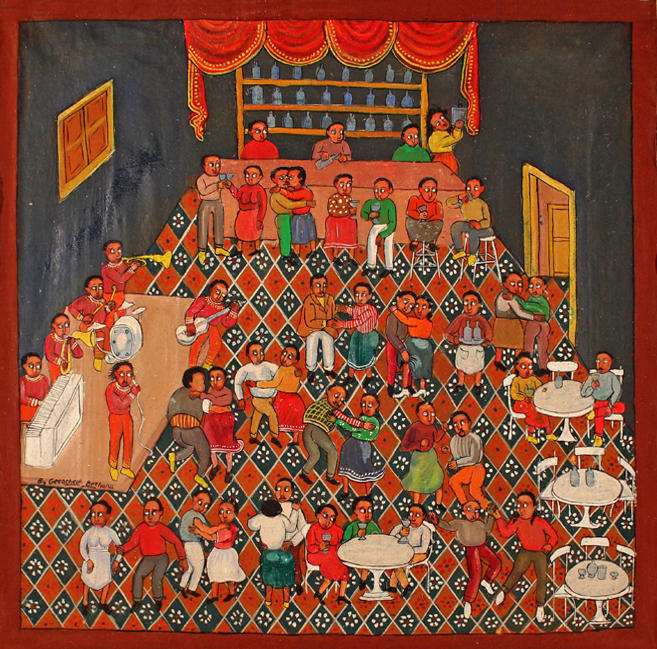 Charmante représentation de la night-life addissoise. Au son de l'orchestre, composé d'un piano, d'une guitare, de deux cuivres, d'une batterie et d'un chanteur, les couples dansent, s'enlacent, s'embrassent. Le peintre représente un intérieur, ce qui est radicalement nouveau dans les codes de la peinture éthiopienne.